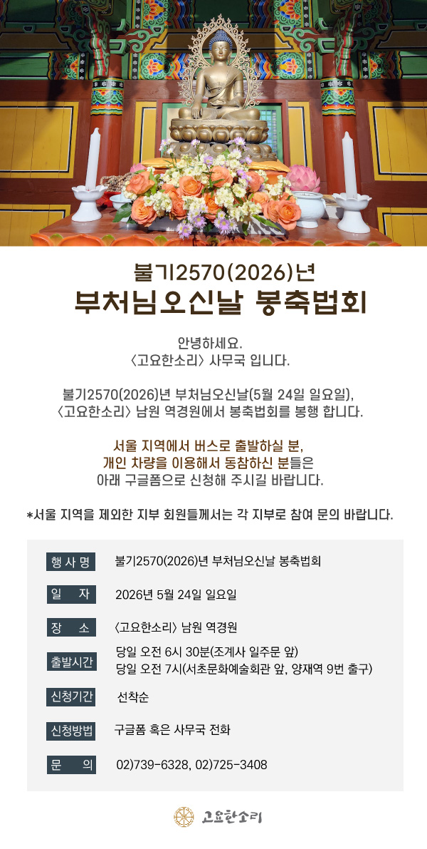 불기2570 (2026년) 부처님오신날 봉축법회 관리자 2026-04-24 조회수 : 51 첨부파일: 2026부처님오신날-봉축법회-안내.jpg ☞부처님오신날 봉축법회 참여 신청 구글 신청폼>>