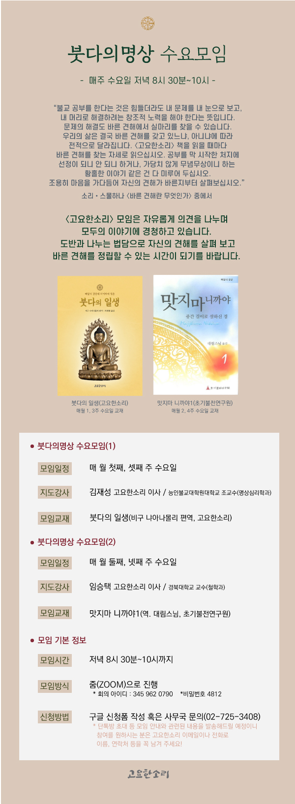 붓다의 명상 수요 모임 안내(상시 모집) 관리자 2021-04-14 조회수 : 12839 첨부파일: 수요모임.jpg 1) 신청 바로가기▶▶(https://docs.google.com/forms/d/1S3PP9HABZSlSfuOUGtI3J4lcDHMmnzlUCI7DU9ufrUU/edit2) 온라인 줌 참가 바로접속 링크https://us02web.zoom.us/j/3459620790?pwd=o2h1UnEU9zlvowVlUAdLSGn2GUg26w.1&omn=85103521068- 회의 ID: 345 962 0790 - 암호 : 4812