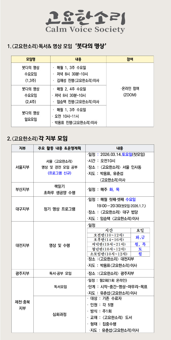 〈고요한소리〉 지부 별 활동(모임)을 안내 드립니다.